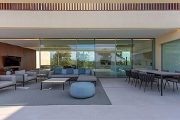 Die Küche geht in das Ess- und Wohnzimmer über und bietet ein grenzenloses Licht- und Raumgefühl. Elektrische Schiebetüren öffnen sich vom Wohnzimmer zur großen Terrasse und zum Außenpool. Im Wohnzimmer ist auch ein Kamin installiert.